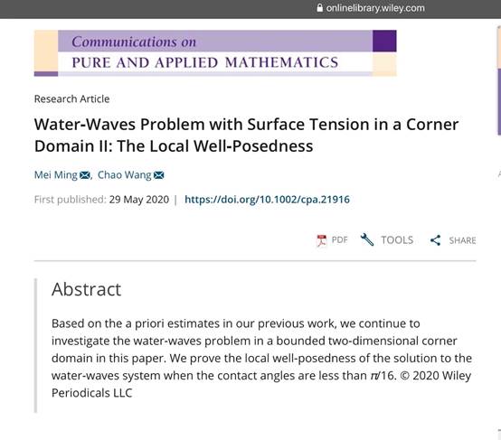 近日,beats365唯一官网入口官网明梅副教授与合作者的论文“Water waves problem with surface tension in a corner domain II: the local well-posedness”在国际顶尖数学期刊Communications on Pure and Applied Mathematics(CPAM)上在线发表。CPAM由国际最负盛名的应用数学研究所之一—柯朗数学科学研究所(Courant Institute of Mathematical Sciences)于1948年创刊,发表纯粹与应用数学、数学物理等研究领域具有突破性的一流研究成果。该杂志每年刊载不到百篇论文,在数学界有极高的知名度和影响力,属于数学类最顶尖的期刊之一。例如,CPAM曾在2013年被ISI Journal Citation Reports评价为302种入选数学类刊物第一名。
