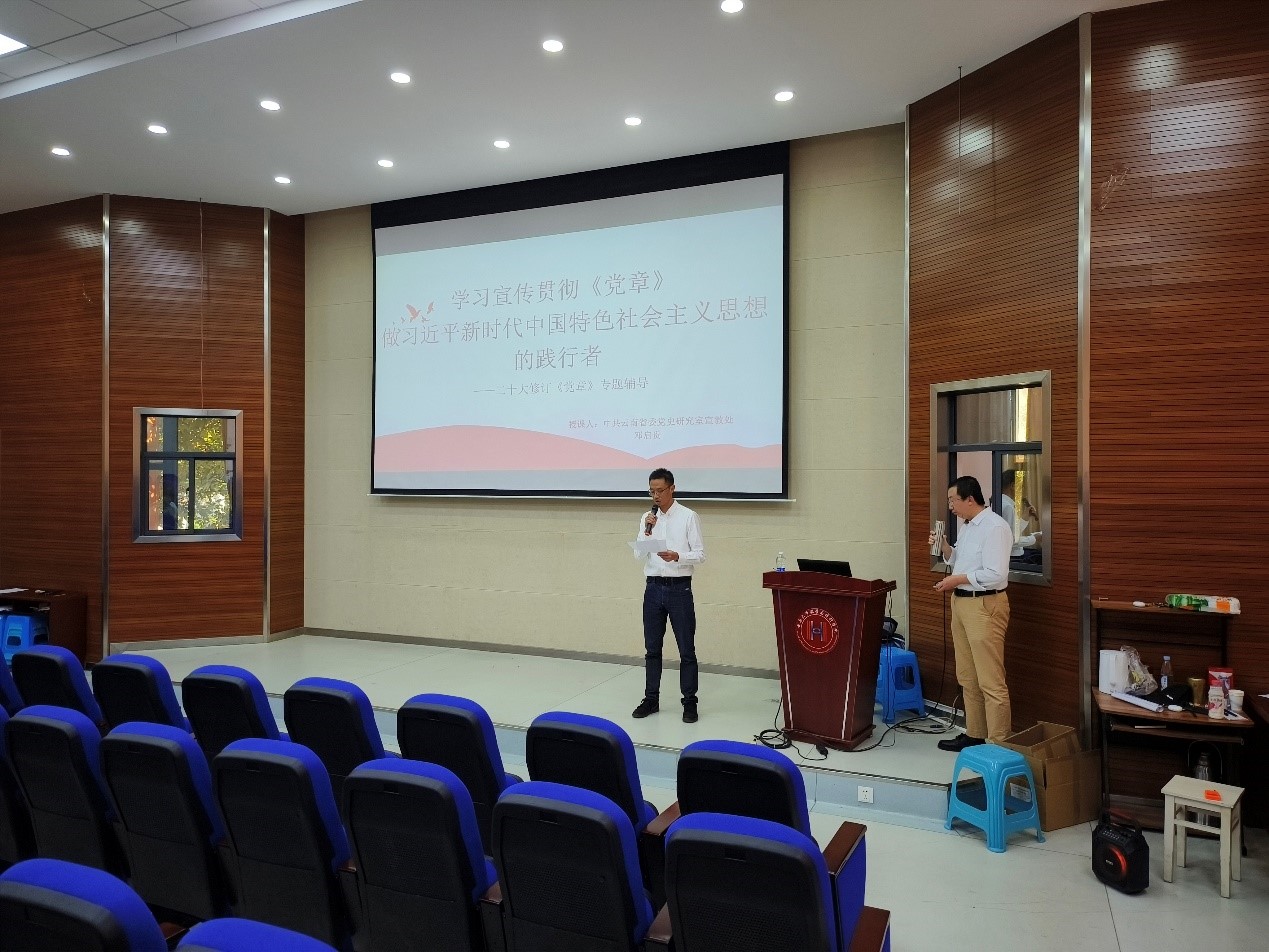 2023年10月27日星期五下午,beats365唯一官网入口官网邀请到中共云南省委党史研究室邓启贵副处长,在格物楼3103报告厅开展 ““解读二十大精神——学习宣传贯彻《党章》”主题讲座”。公司党委书记徐瑾主持本次讲座。