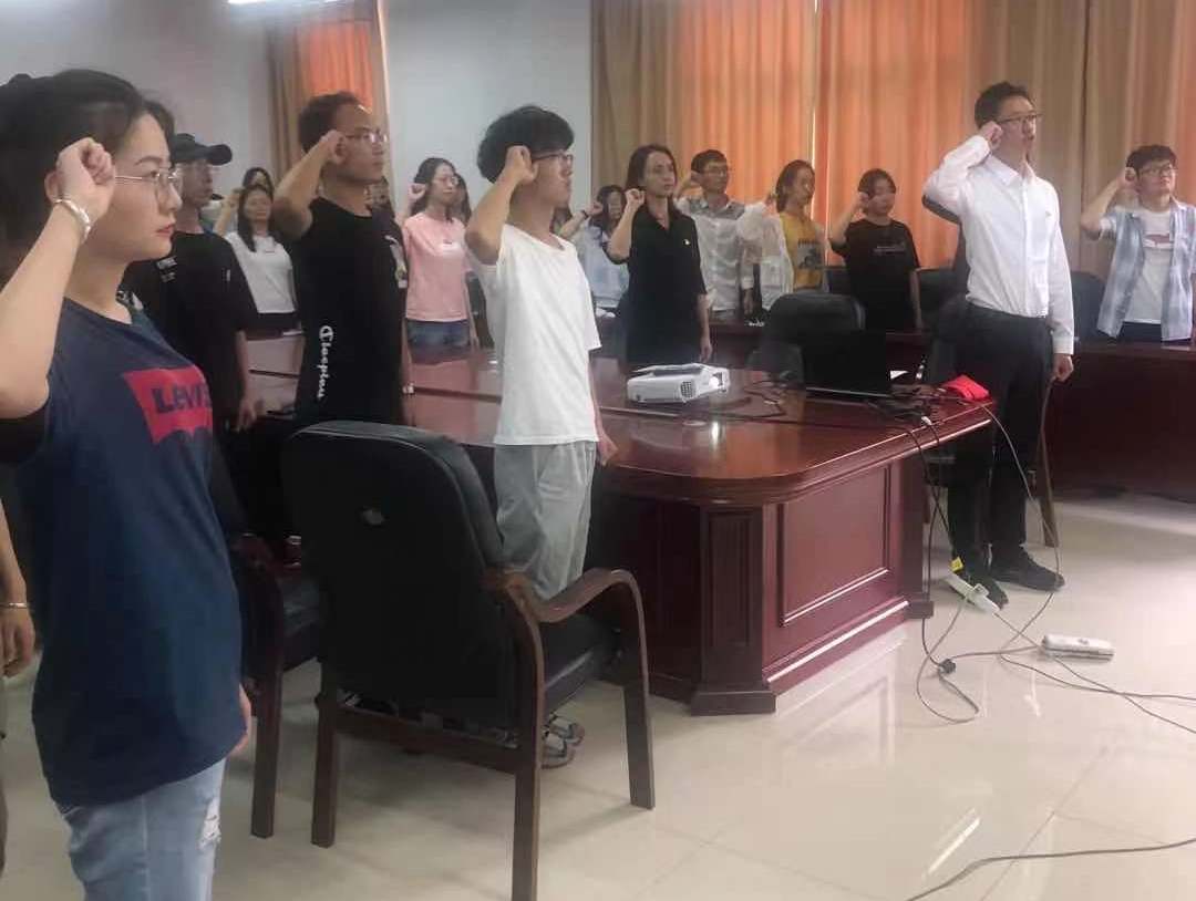 随后,徐瑾作为领誓人带领全体同志在党旗下进行宣誓,同志们铿锵有力的宣誓声充满整个教室,举起的右手是每一个党员需要肩负起的责任,坚定的眼神是每一个党员忠诚的彰显,全体同志表现出了坚定的信念和激昂的斗志。