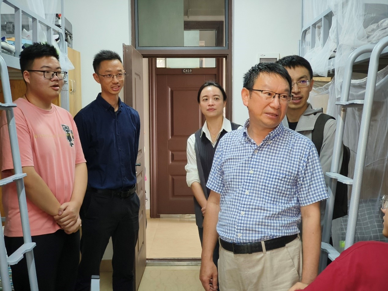 8月24日下午15:00,公司党委书记徐瑾老师、经理唐年胜老师、党委副书记杜芳芳老师以及本科生新生辅导员王蔓琦老师、2023级数学与应用数学班主任陈愫素老师、信息与计算科学班主任陈子恒老师、统计学班主任张韵棋老师、数据科学与大数据技术班主任荣尧老师走访了新生宿舍询问他们的情况,不仅对新生的校园生活表达殷切的关心,同时以最美好的祝愿希望同学们能够在这里实现青春的梦想。