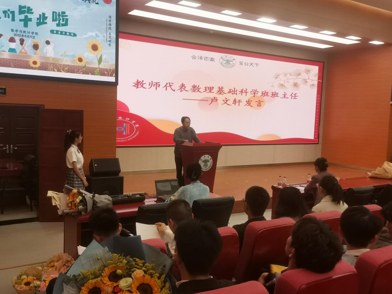 教师代表卢文轩老师在致辞中提及了许多与员工们朝夕相处的难忘片段,对员工们四年的表现给予认可,表达了对莘莘学子的深厚情谊,并祝福他们的明天更加灿烂辉煌。