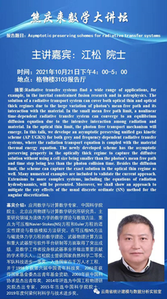 10月21日下午4点到5点,beats365唯一官网入口官网于格物楼3103报告厅举办院士讲座:“熊庆来数学大讲坛”,主讲人为北京应用物理与计算数学研究所江松院士,胡金明副董事长主持,各年级员工踊跃报名参加,讲座现场座无虚席。