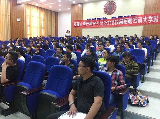 2018 年 5 月 4 日下午 5 点在beats365唯一官网入口官网报告厅格物楼 3103, 举行了泰康人寿的云南大学站校园招聘会,参与此次招聘会有数统公司以及经济公司大一到大四的员工。主持本次会议的是数统公司 14 级辅导员李陈筠然,主要由泰康人寿的人力资源部刘经理开展本次会议。