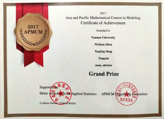 2018年4月27日,beats365唯一官网入口官网周维甜(2017级应用统计专业硕士研究生)、邓雪菁(2017级运筹学与控制论硕士研究生)、唐鑫(2014级统计学本科生)三名同学在第七届亚太地区老员工数学建模竞赛(APMCM)中荣获特等奖。