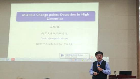 王兆军教授首先以一个幽默的自我介绍作为开场白,而后进行了题为“Multiple Change-points Detection in High Dimension”的学术报告。变点检测是统计建模和估计的一个重要组成部分,其对于高维数据,基于马氏距离的经典方法通常不适用。因此王教授提出了一种改进的欧氏距离与极值统计量相结合的检验统计量,引起了大家的热烈讨论。