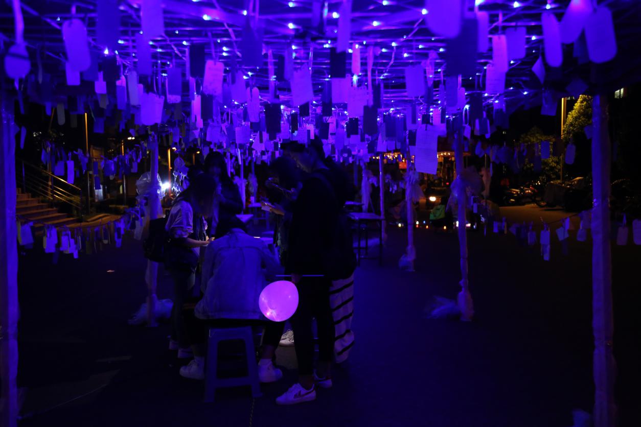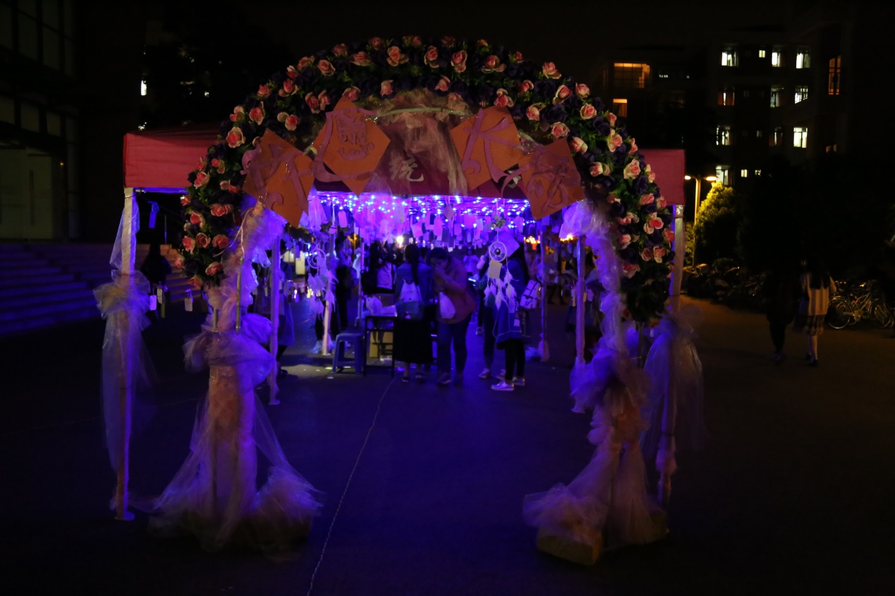 4月23日,经过工作人员一个上午的努力,长廊被布置得十分温馨。特别是晚上,长廊在霓虹灯的照耀下,更显梦幻。长廊分为感恩区和许愿区,同学们可以在感恩区写下对自己和朋友的希望和想说的话以及对女生节的祝愿和期待;在许愿区内,女生可以写下自己的小心愿。男生可以在长廊下挑选自己力所能及的事情然后通过纸片上的联系方式找到女生为她们实现愿望。