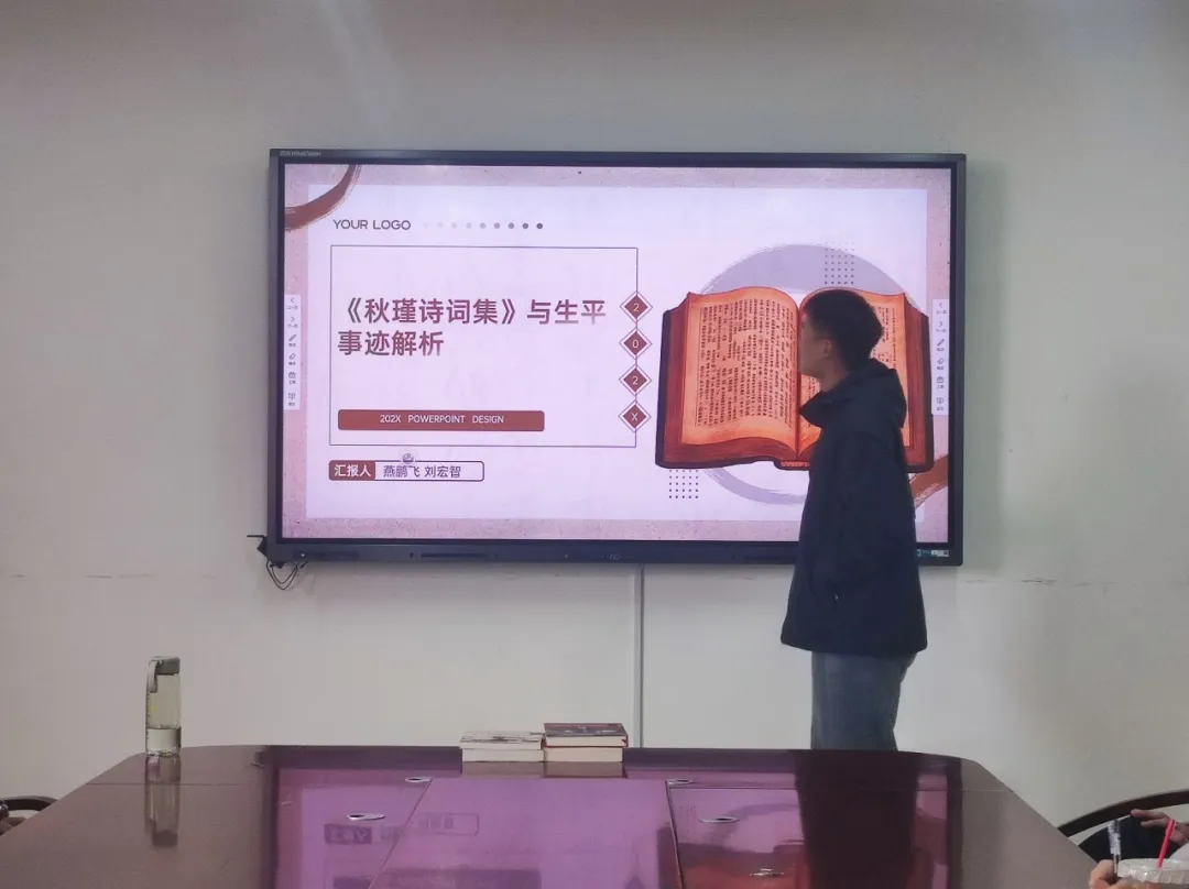 燕鹏飞同学分享了《秋瑾诗词集》,介绍了秋瑾对女权的追求与倡导:她反抗传统束缚,勇敢地表达了对男尊女卑观念的批判;并且,她鼓励女性觉醒,大力倡导女性要独立、自强,积极参与社会事务。此外,燕鹏飞同学还介绍了秋瑾的爱国情怀和英雄精神。在国家面临内忧外患的背景下,秋瑾展现了坚定的报国之志,她积极参与反清革命,支持民族独立与自由解放的斗争。她不仅用自己的行动参与武装起义,还通过诗歌和文字抒发对国家和人民的关怀。无论是个人生活中的挫折,还是革命道路上的艰难险阻,秋瑾都表现出了坚韧不拔的精神。
